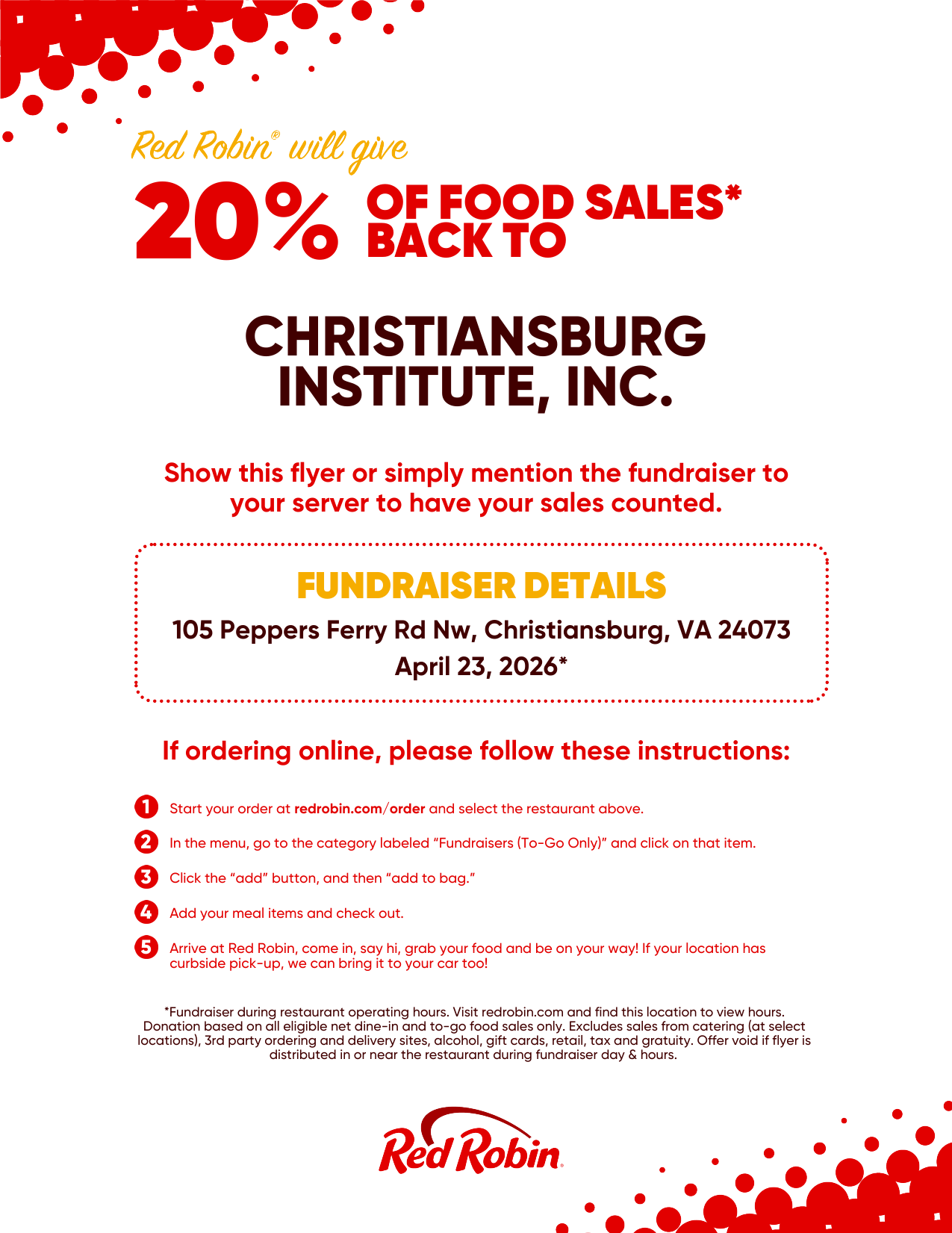 Christiansburg Institute, Inc. (CI, Inc.) is excited to host a community fundraiser at Red Robin on Thursday, April 23, 2026. On this day, 20% of all eligible food sales at Red Robin (105 Peppers Ferry Rd NW, Christiansburg, VA 24073) will be donated to Christiansburg Institute, Inc.